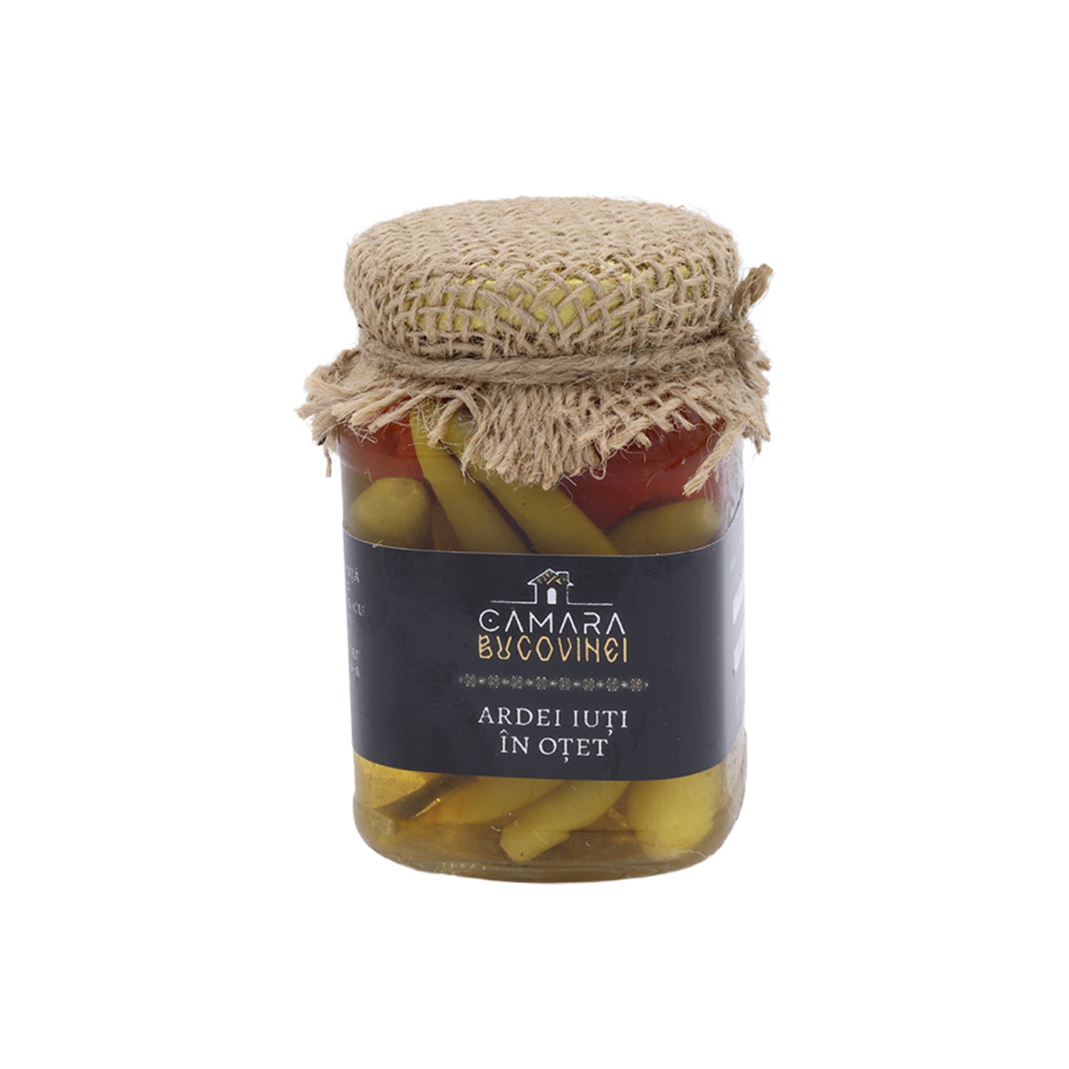 Adaugă o notă picantă oricărui preparat cu Ardeii iuți în oțet (200 g) de la Cămara Bucovinei — o delicatesă tradițională, pregătită simplu și natural.