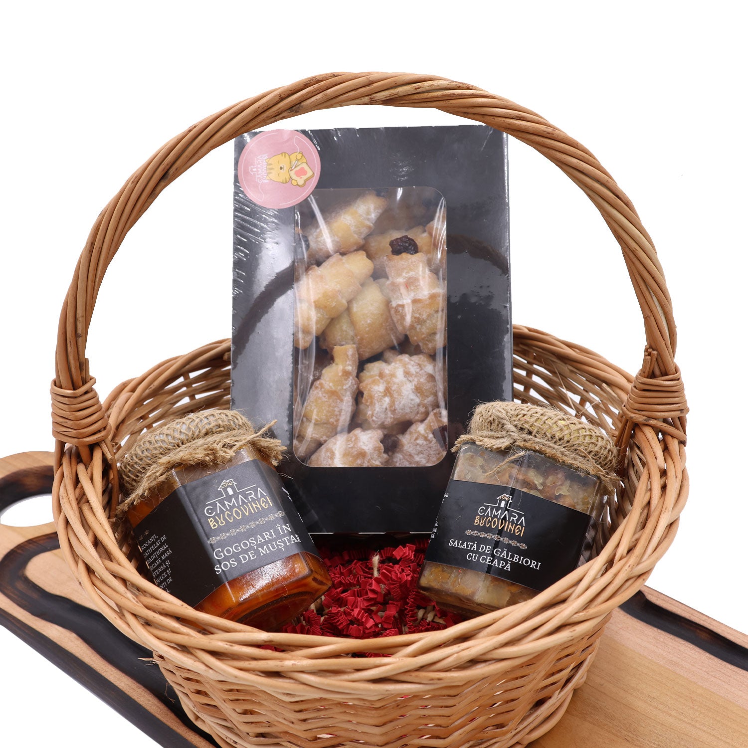 Bucură-te de un coș tradițional bucovinean plin de gusturi autentice – gogoșari în sos de muștar cu aromă ușor dulce-picantă, salată de gălbiori cu ceapă preparată după rețetă locală și delicioase cornulețe cu magiun făcute ca la bunica acasă.