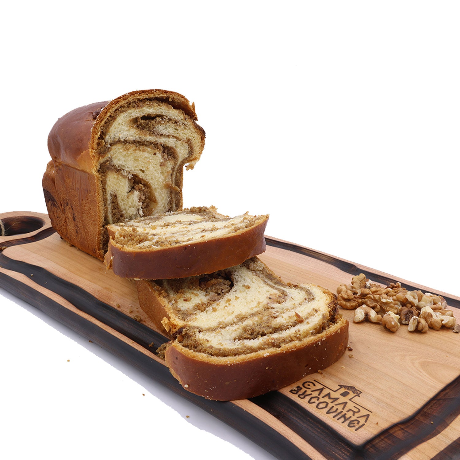 Frământat manual din făină de grâu, ouă proaspete, lapte, unt și drojdie naturală, acest cozonac se remarcă prin textura sa pufoasă și aroma bogată a umpluturii de nucă și stafide.