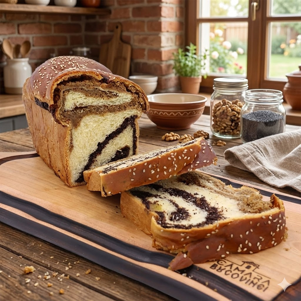 Frământat manual din făină de grâu, ouă proaspete, lapte, zahăr și drojdie naturală, cozonacul are un aluat pufos și o umplutură generoasă din nucă măcinată și mac aromat.
