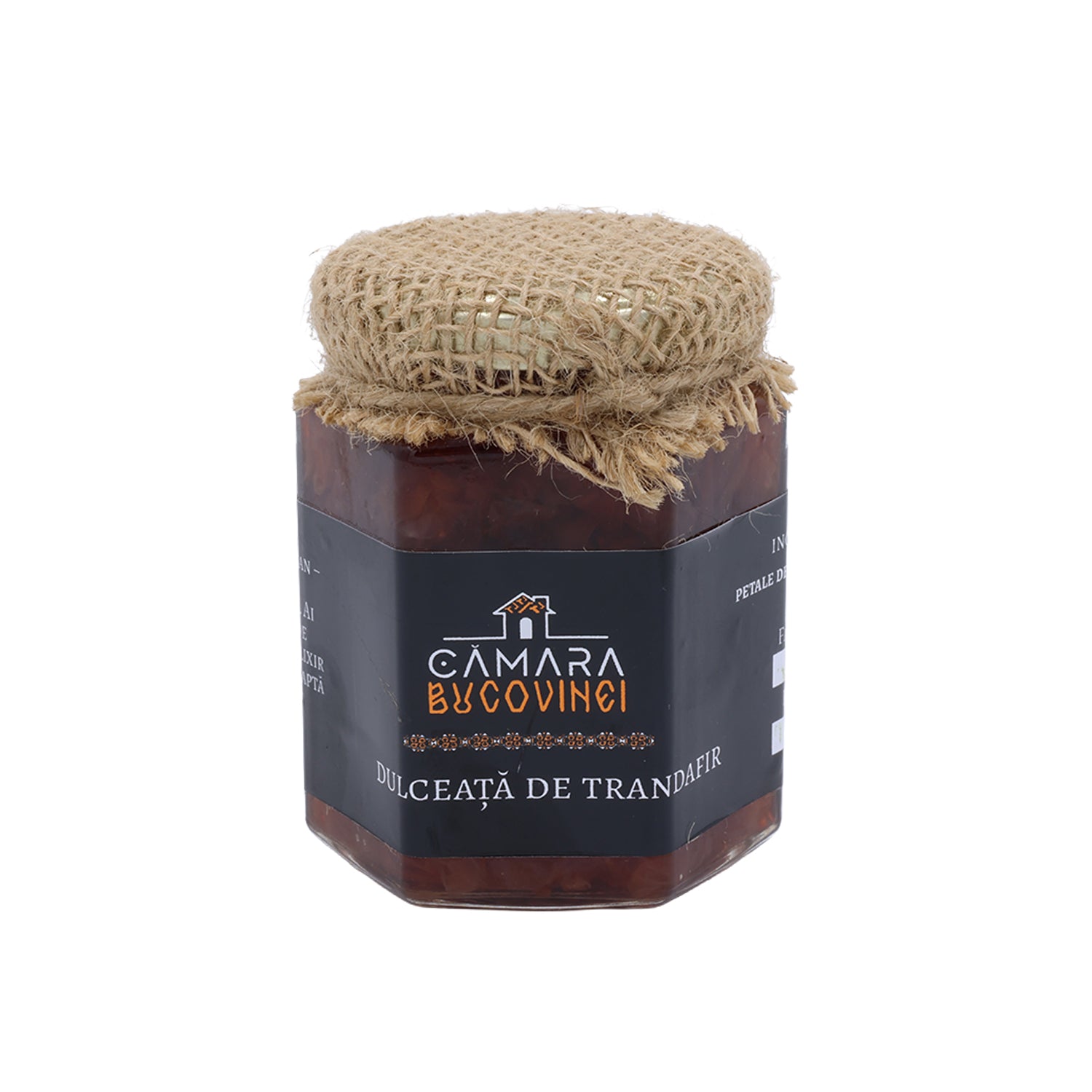 Răsfață-ți simțurile cu Dulceața de trandafir (200 g) de la Cămara Bucovinei, un preparat artizanal deosebit, realizat din petale de trandafiri parfumate, zahăr și lămâie.