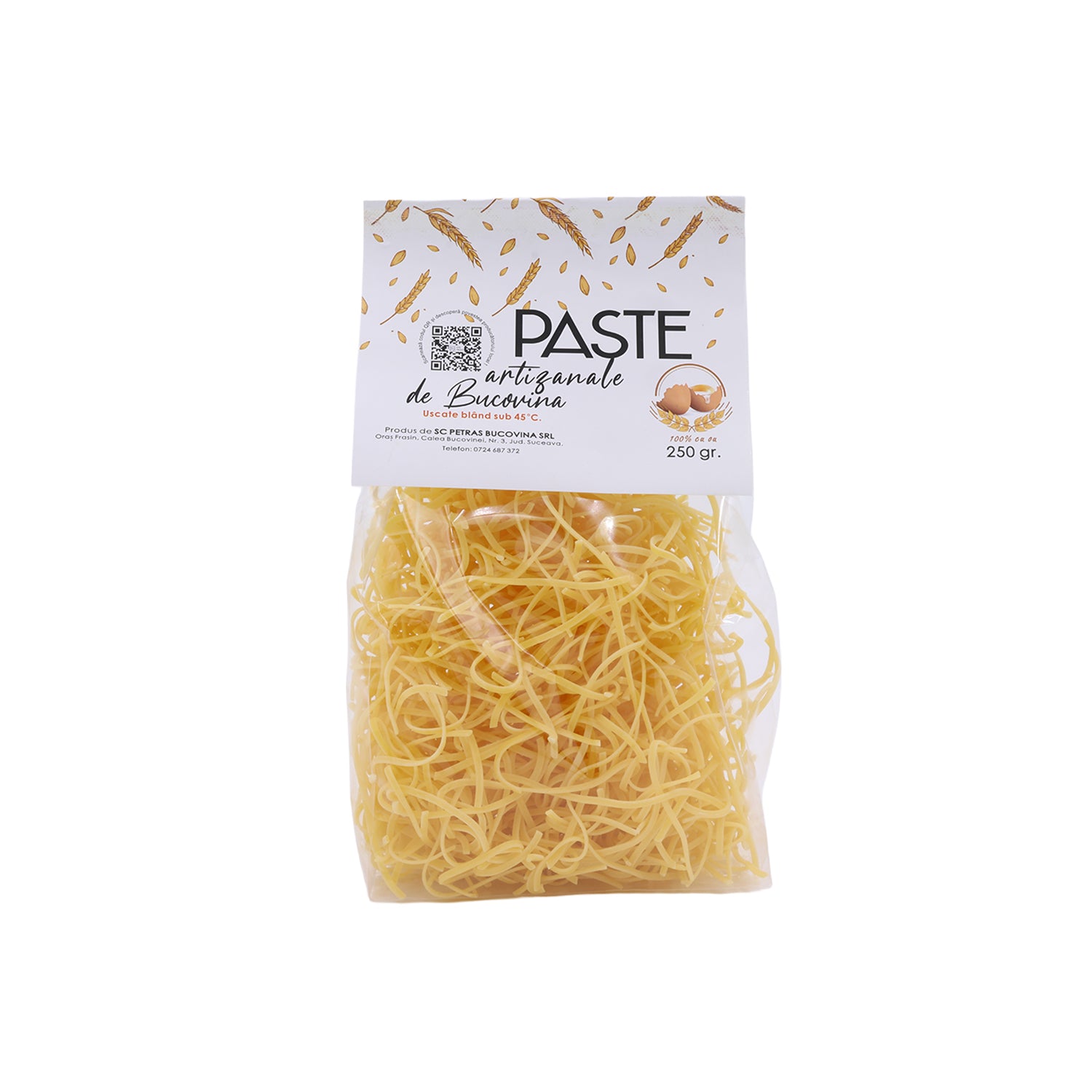 Savurează gustul autentic al pastelor de casă cu Pastele cu ou (250 g) de la Cămara Bucovinei, realizate manual din făină de grâu dur și ouă proaspete, după rețete tradiționale bucovinene.