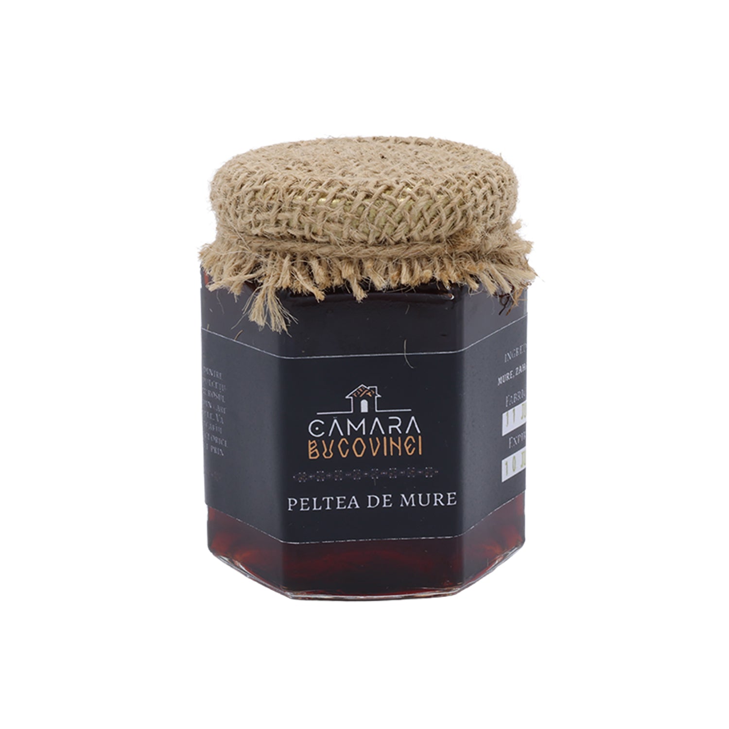 Descoperă savoarea autentică a fructelor de pădure cu Pelteaua de mure (200 g) de la Cămara Bucovinei, preparată tradițional din mure coapte, zahăr și un strop de suc de lămâie.