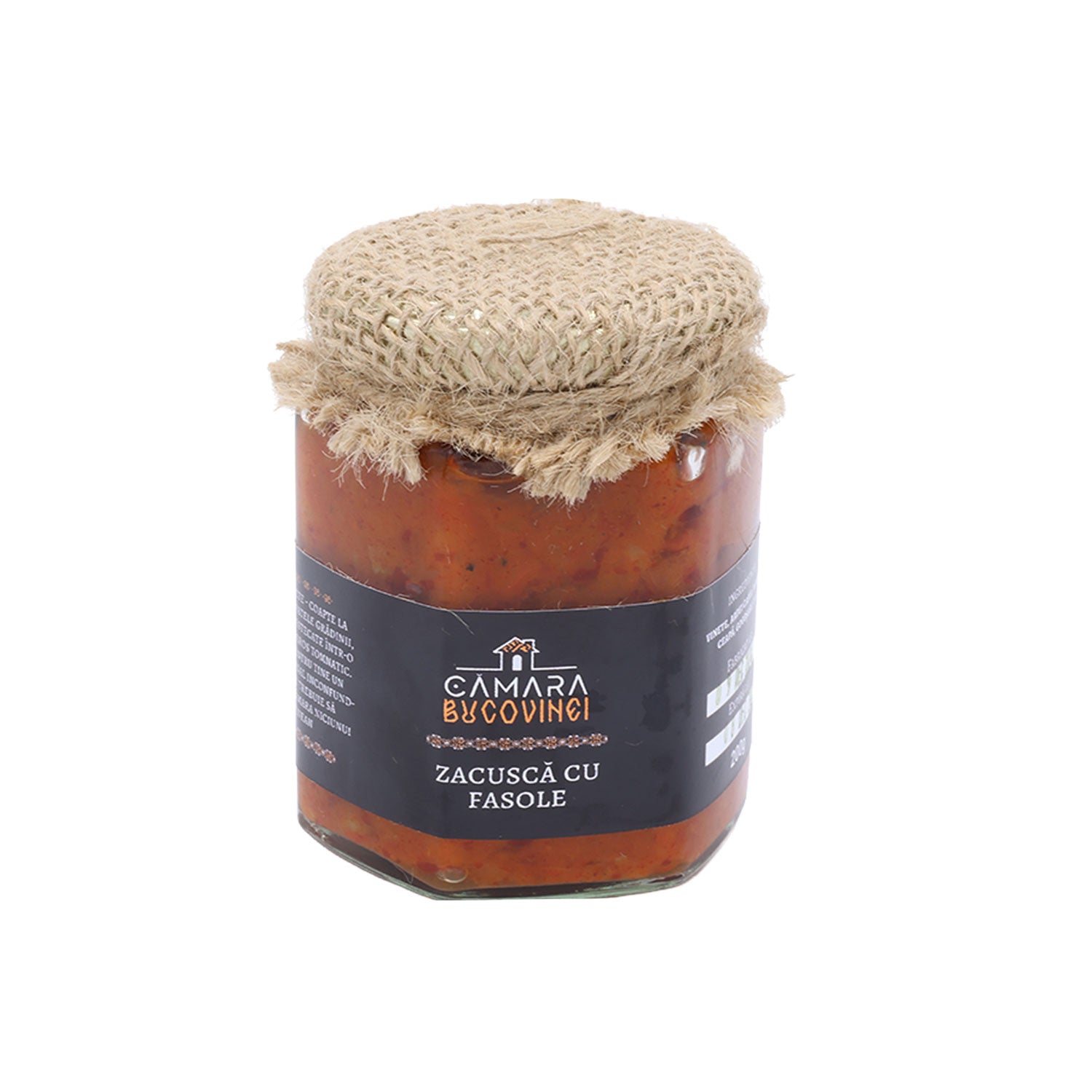 Gustul autentic al Bucovinei se regăsește în Zacusca de fasole (200 g) de la Cămara Bucovinei, un preparat artizanal gătit lent, din fasole albă fiartă, ardei capia, morcov, ceapă, gogoșar și ulei natural.