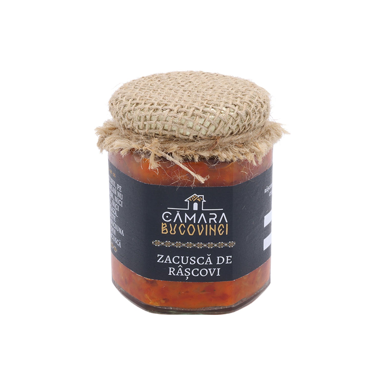Gustul autentic al pădurilor bucovinene într-un borcan! Zacusca de râșcovi de la Cămara Bucovinei este preparată artizanal din râșcovi de pădure (ciuperci aromate și cărnoase), combinate cu ardei capia, morcov, ceapă, gogoșar și ulei natural, gătite lent pentru a obține o savoare bogată și echilibrată.